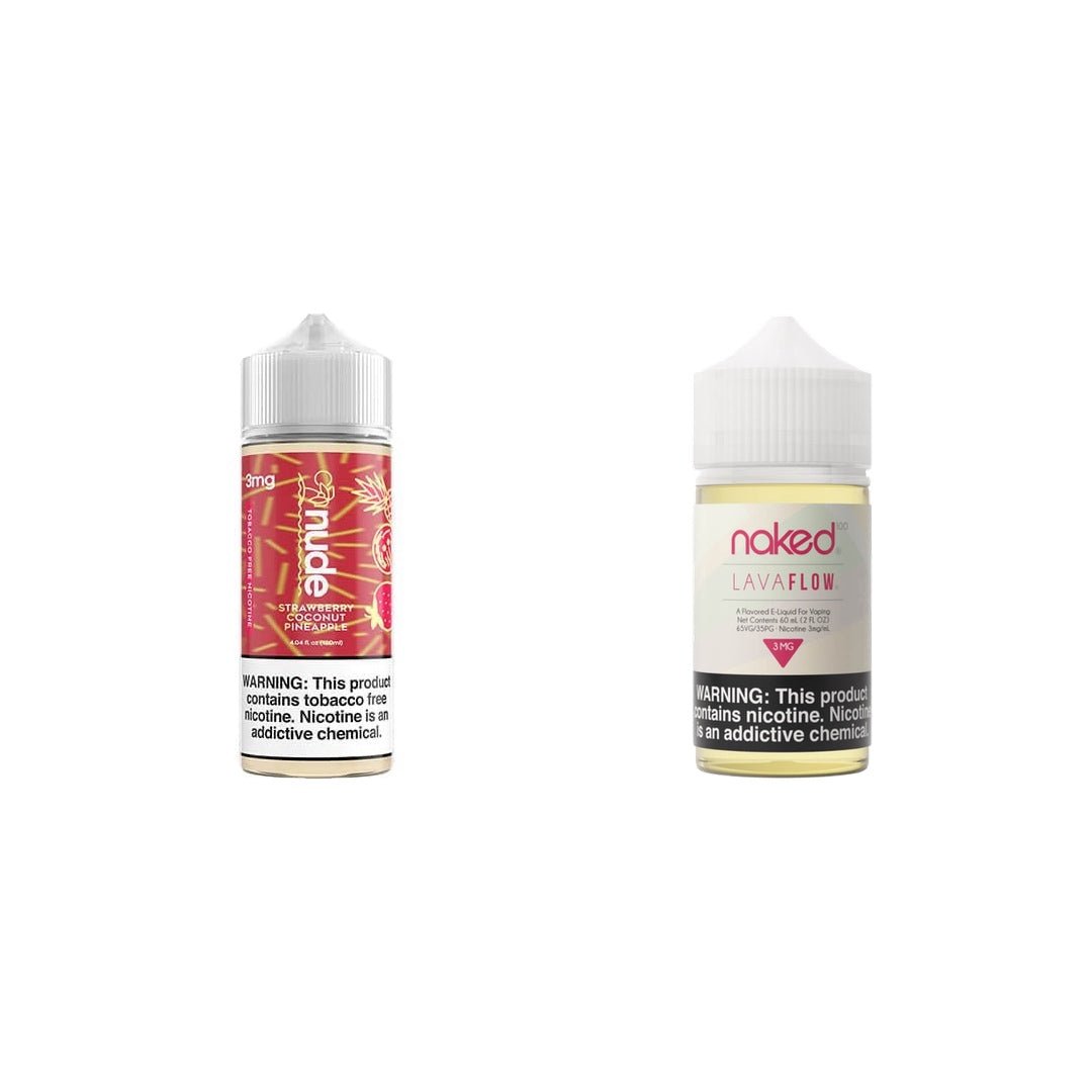 S.C.P. Ejuice by Nude Ejuice and Lava Flow Ejuice by Naked 100 have been some of the most sought-after fruit flavored ejuices in the entire vaping industry. Save a bundle with our two pack and puff on the delicious clouds of strawberries, coconuts, and pineapples by Nude and Naked 100 for as long as your vape taste buds desire!