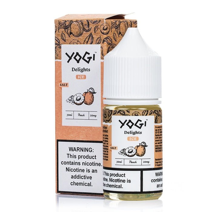Experience the perfect balance of succulent peaches and a menthol chill in Peach Ice Salts by Yogi Delights, enriched with synthetic nicotine salts.